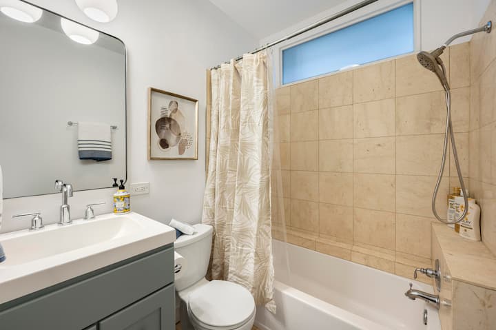 Er liggen CTA-sporen achter. Deze woning heeft geen ramen aan die kant waar de trein passeert het NIET te luid is, maar je hoort het wel als je oplet. We hebben elke slaapruimte uitgerust met hoogwaardige witte geluidmakers die geen lawaai maken terwijl ze proberen te slapen. Ook zijn alle ramen voorzien van zware, geluidsreducerende gordijnen. We denken dat je het lawaai van de trein na het gebruik van geluidsmakers klein zult vinden, maar we moeten dit wel opmerken.