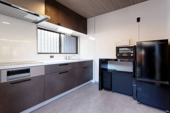 De ruime eetkamer, volledig uitgeruste keuken, twee kamers in Japanse stijl en een kamer in westerse stijl bieden plaats aan maximaal 10 personen.