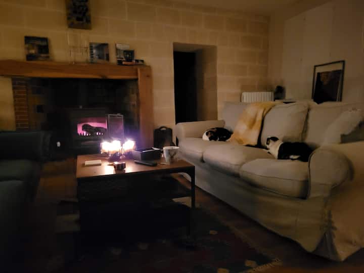 De primaire toegang tot het hoofdgebouw is via een overdekte zij-ingang vanaf de omheinde oprit. Hier kom je in de modderkamer/kantoorruimte die direct leidt naar een open en lichte keuken en eetkamer (60 m ²). Twee treden leiden naar beneden naar de woonkamer (35 m ²), met zijn hoge openslaande deuren, houtkachel en zeer comfortabele zithoek.