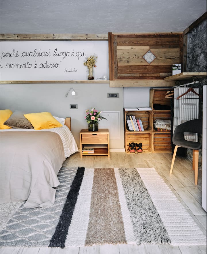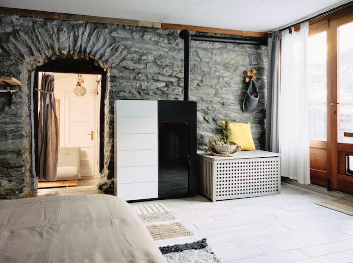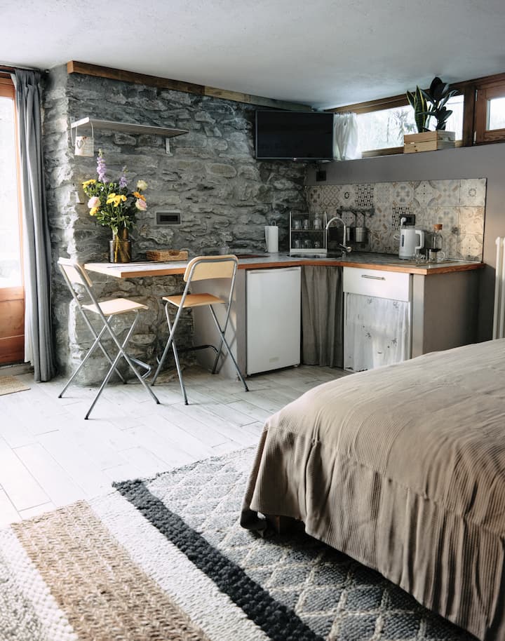 Welkom in onze studio, onderdeel van een verbouwd landhuis uit 1700, met een prachtig uitzicht op de Mont-Blanc, op 15 minuten afstand van het lokale skigebied Courmayeur.