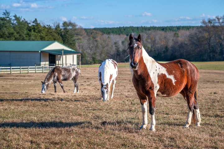 Aangezien dit een werkende boerderij is, kun je de eigenaren zien die de paarden of andere boerderijtaken verzorgen tijdens de vroege ochtenden en late middagen. Ze wonen in een aparte woning op het terrein, met respect voor je privacy en zijn ook beschikbaar voor een warme hallo of hulp. Gasten mogen de accommodatie verkennen via rondleidingen, waaronder paden en ATV-ritten (kleine donaties gewaardeerd). Paardrijlessen zijn ook beschikbaar tegen een extra vergoeding van $ 50 (afstandsverklaring vereist). Je kunt ook de aangrenzende antiekwinkel bezoeken om op vintage juweeltjes te jagen.