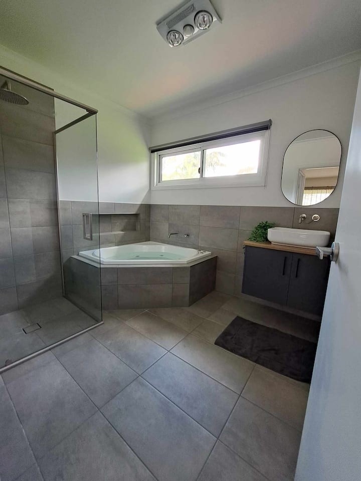 Badkamer – Douche, hoekspabad, wastafel en haardroger en een apart toilet.