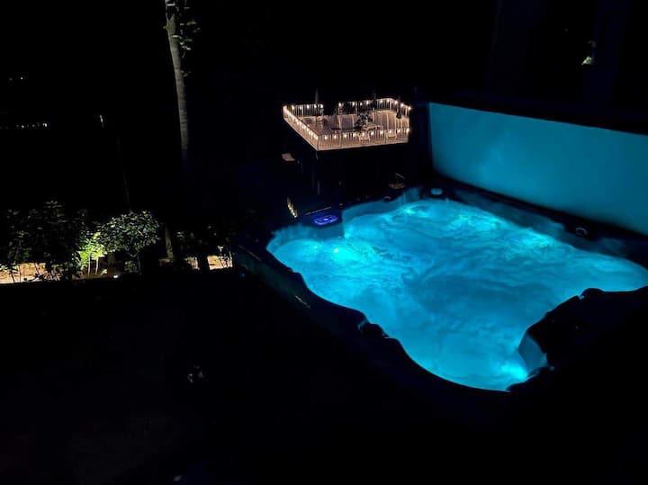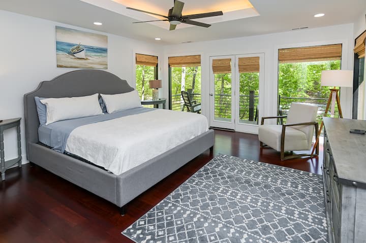 Ontsnap naar de Captain 's Quarters, een charmant toevluchtsoord aan het meer. Ontspan in ons toevluchtsoord met meerdere verdiepingen, met kamerhoge ramen, een gastronomische keuken en serene mastersuites met een betoverend uitzicht op het meer. Deze ruime woning is ontworpen voor grote groepen en beschikt over zes slaapkamers en biedt in totaal 11 bedden, wat privacy en comfort garandeert. Geniet van het buitenleven met onze eigen aanlegsteiger, een bubbelbad en heerlijke voorzieningen, allemaal tegen de achtergrond van Tim 's Ford Lake.
