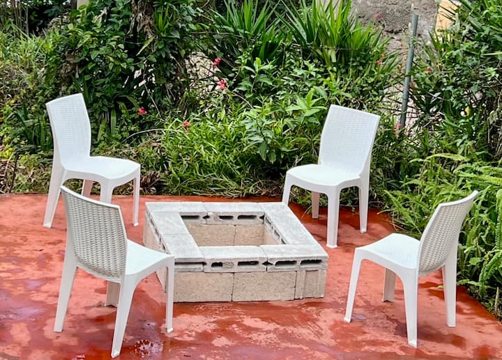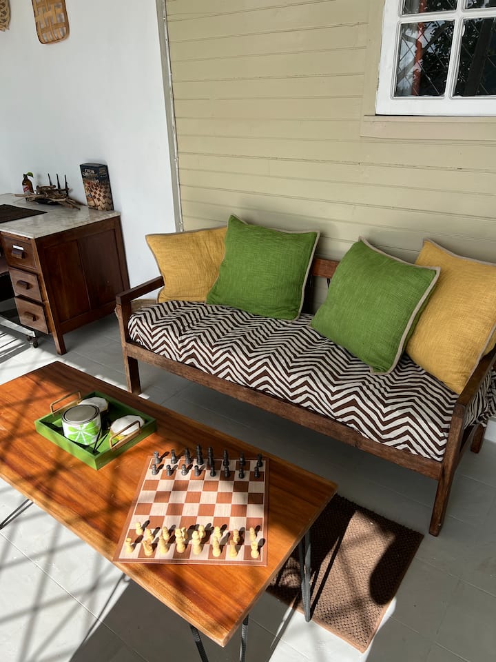 A: Onze boerderij is volledig uitgerust met moderne voorzieningen, waaronder comfortabele bedden, een volledig gevulde keuken met een focus op internationale koffiezetmethoden - een bonenmolen, waterkoker, koffieschaal, Franse pers, Moka Pot & Pour Over-apparatuur, een blender, broodroosteroven, vierpits gasfornuis en oven, grote en minikoelkast, een fles van 5 liter lokaal bronwater, een EHBO-kit, een selectie spellen zoals Dominoes, Parcheesi, chess, chess, checkers en speelkaarten, meditatieve kleurboeken en kleurpotloden, een collectie boeken geschreven door Jamaicaanse en internationale auteurs, een Bluetooth-luidspreker, gratis parasols en handdoeken, wifi en een gezellig woongebied met een panoramisch uitzicht op de boerderij en de Blue Mountains.