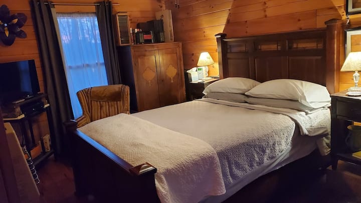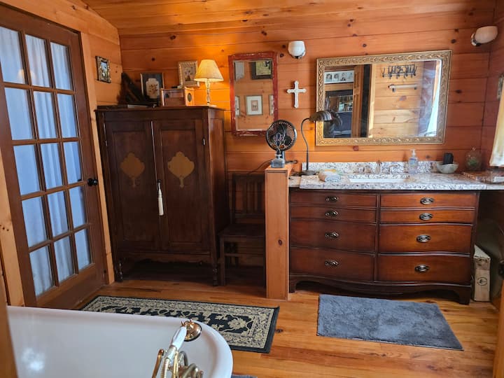 Houten huisje is 800 m ², een slaapkamer met prachtig queensize bed, (Serta hybride luxe matras) gewelfd plafond grote kamer heeft een houtkachel voor sfeer (brandhout inbegrepen), een full-size futon ligbed en een slaapbank plus eettafel voor 6 personen. Alle beddengoed/handdoeken/kussens en dekens aanwezig. Een prachtige complete badkamer met antiek bad op pootjes met eindeloos 'Insta-boil' warmwatersysteem. Bad heeft een douchestang, maar geen staande doucheapparatuur. Volledige keuken (alle kook- en eetapparatuur aanwezig), afgeschermd in de veranda aan de achterkant fungeert als tweede woonkamer met een andere houtkachel voor sfeer, rond de woonruimtes af. De hut is volledig off-grid met een volledig functionerend zonnesysteem dat regen of zonneschijn werkt (dankzij de super grote batterijcapaciteit). Mobiele service is geweldig, geen problemen met streamen naar je apparaten. MAXIMAAL zes gasten. Seclusief en privé, een perfecte Get A Way !! Maak je geen zorgen over het acclimatiseren aan de hut en hoe het werkt, een complete en gemakkelijk te volgen gids wordt bij het reserveren doorgestuurd met informatie over verwarmingssystemen (propaan), 2 functionerende open haarden (brandhout inbegrepen in de huurprijs ) zonne-energie, bad- en keukenfunctionaliteit (allemaal functioneren zoals je een normaal huis met kleine aanpassingen zou verwachten - zie deze wijzigingen hieronder). De meeste gasten hebben een lange lijst van activiteiten, neem je buitenactiviteitenuitrusting mee om te wandelen of kajakken, vistuig, enz. - maar de meeste gasten hebben de neiging om te ontspannen in de hut en wandelingen te maken op mijn 11 hectare grote bergterrein. Hoewel huisdieren welkom zijn, ben je verantwoordelijk voor EVENTUELE extra schoonmaak of schade. Als je huisdier een 'plasblok' gebruikt, breng ze dan niet naar mijn hut. Huisgebroken betekent dat ze betrouwbaar zijn om het vast te houden totdat je ze naar buiten laat gaan. Je huisdier kan niet worden achtergelaten om zichzelf te ontlasten op mijn veranda. Ik kan niet geloven dat ik dit in mijn beschrijving moet opnemen, maar leef en leer. Er zijn twee buitenvuurplaatsen, een voor de hut, de andere dichter bij de top van het pand op slechts een steenworp afstand van de hut. Wandelen is spectaculair met de Appalachian Trail, Virginia Creeper Trail, National Forrest service trails onder andere op enkele minuten van de accommodatie.