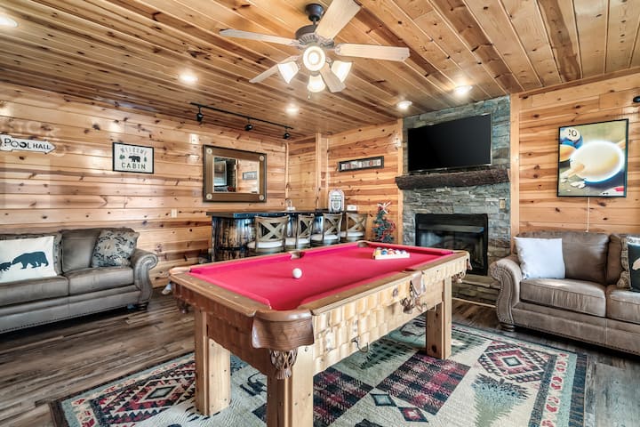Een minibar met een koelkast ter grootte van een slaapzaal, een bar, een pubtafel, een stenen open haard en een flatscreen-tv met spectrumkabel bevinden zich ook in de speelkamer.