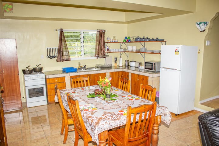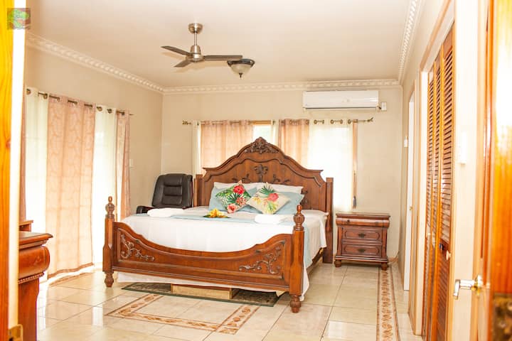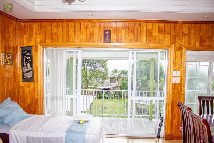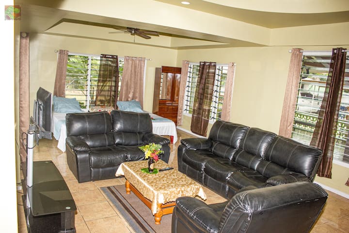Dit is een toevluchtsoord van twee verdiepingen met een luxe appartement met 1 slaapkamer op de bovenste verdieping met een en-suite badkamer en een eigen balkon waar je kunt genieten van het spectaculaire panoramische uitzicht op de oceaan op de zonsopgang en zonsondergang van Vaitele tot het schiereiland Mulinuu. De ruime woonkamer is geschikt voor de loungeset voor het bekijken van een 32” Smart TV die al is ingesteld met gratis wifi (50 GB voor 14 dagen), Netflix, Prime en lokale kanalen, waaronder streaming-apps naar wens. Het beschikt ook over een eettafel voor zes personen en een kitchenette met een magnetron, een waterkoker, een broodrooster en een rijstkoker. Om het af te maken, zijn twee extra eenpersoonsbedden voor kinderen/volwassenen ook beschikbaar voor extra gasten (optioneel) voor het gemak.