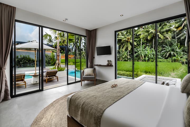 Elke slaapkamer in Villa Dulcedo Vitae is met zorg ontworpen voor jouw comfort. Elke kamer beschikt over een zacht beddengoed, airconditioning, een smart-tv en een eigen badkamer. Slaapkamers 1 en 2 hebben tweepersoonsbedden die kunnen worden omgebouwd tot twee eenpersoonsbedden. Slaapkamers 3, 4 en 5 zijn voorzien van kingsize bedden. Daarnaast biedt slaapkamer 5 een exclusief uitzicht op de rijstvelden.