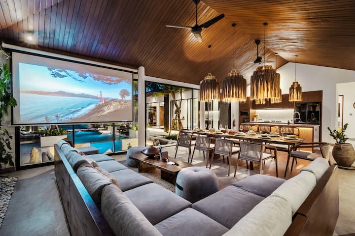 Stap in de open leefruimte, waar moderniteit en natuur elkaar ontmoeten. Het hart van Villa Dulcedo Vitae beschikt over een moderne keuken, compleet met een wijnkoeler, uitnodigende culinaire avonturen. Verzamel rond de eettafel voor onvergetelijke maaltijden. Laat je zakken in de zachte bank met een verticale tuinachtergrond en geniet van een filmavond vanaf het LCD-scherm met een projector. Twee plafondventilatoren zorgen voor een luchtige sfeer van deze gedeelde ruimte met een prachtig uitzicht op het zwembad en de jungle.