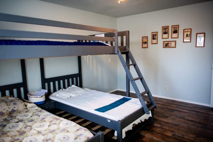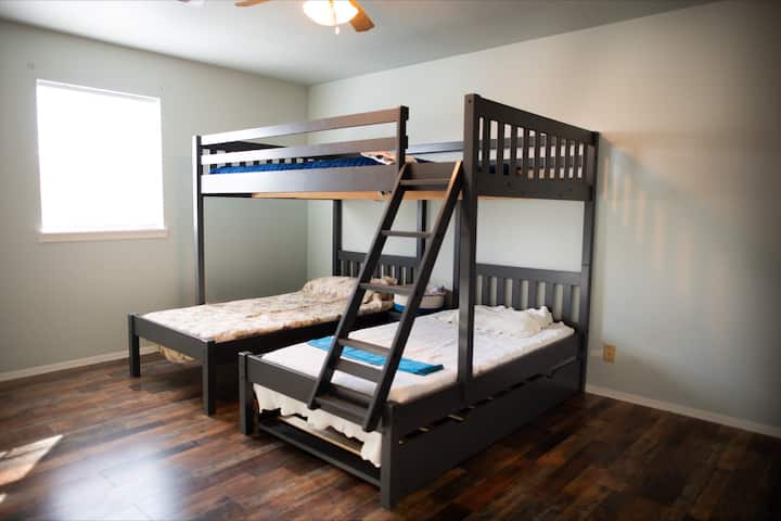 Rancher Suite is 1 van de 4 suites in Homestead-huis met een eigen queensize slaapkamer, badkamer en stapelbed: twin/twin/ full bunk & twin trundle bed. De kamers van JE suite zijn allemaal gecodeerd en komen uit op de GEDEELDE OPENBARE overloop op de bovenverdieping. Er is een andere suite buiten de overloop. ER KUNNEN ANDERE SUITES TEGELIJKERTIJD met JOU worden GEBOEKT.