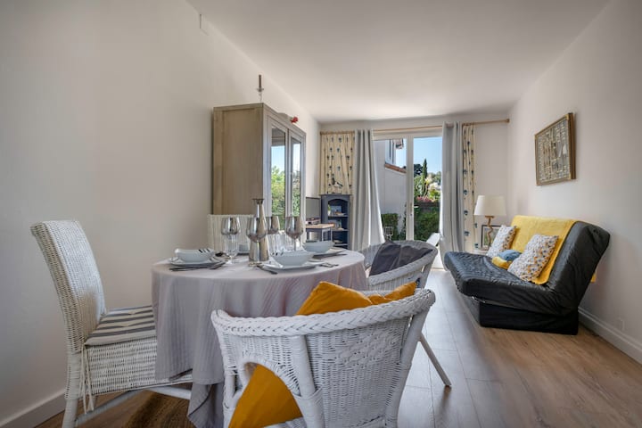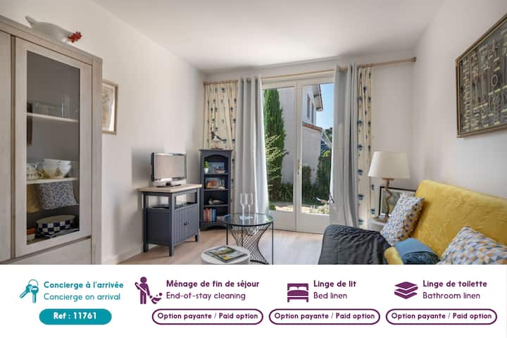 Gelegen aan de poorten van de historische en commerciële wijk en op slechts 400 m van het strand en Port de la Noëveillard, op de begane grond van een kleine, rustige en veilige residentie: "Les Lusignanes". Dit appartement van 40 m² op de begane grond (gerenoveerd in mei 2023) en de eigen tuin hebben een slaapkamer met een tweepersoonsbed en een slaapbank die geschikt is voor maximaal vier personen.