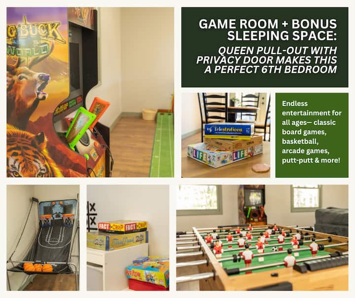 • Enorme speelkamer met arcadespellen, tafelvoetbal, basketbal en een uittrekbare queensize slaapbank. Kan ook dienen als 6e slaapkamer, want het heeft een deur voor privacy.