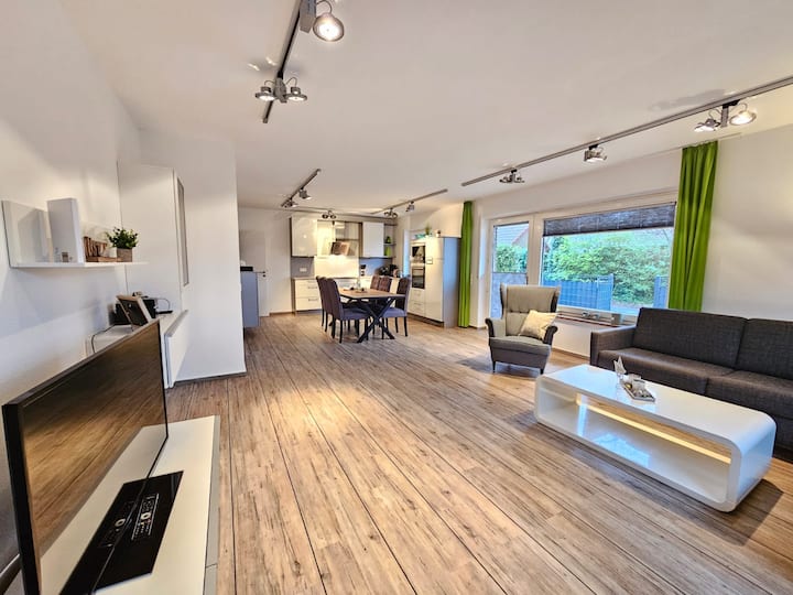 Welkom in het appartement Fiete, je moderne en lichte gelijkvloerse appartement in Norddeich. Het appartement biedt een stijlvol en comfortabel huis voor een ontspannen vakantie aan de Noordzee. Met twee gezellige slaapkamers, een open woon- en eetkamer en hoogwaardige meubels is de accommodatie perfect voor gezinnen, stellen of kleine groepen.