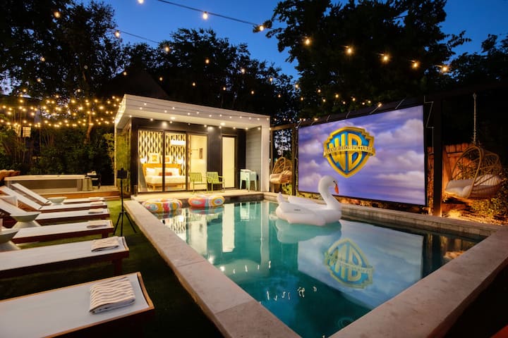 Geniet van de ultieme Austin-ervaring in dit prachtige 5BR/4.5BA SoCo Paradise. Deze moderne woning ligt op slechts een steenworp afstand van de iconische South Congress Ave en beschikt over een heerlijk zwembad, een enorm bubbelbad, buitenfilms, een barbecue, een putting green en twee vuurplaatsen. Ontdek binnen een luxe interieur met een high-end spabadkamer, speakeasy en dakterras met uitzicht. Perfect voor SXSW, ACL, F1 en meer, deze retraite van 3000 vierkante meter is geschikt voor 18 personen en biedt ongeëvenaard entertainment. Boek nu voor een onvergetelijk verblijf in hartje Austin!