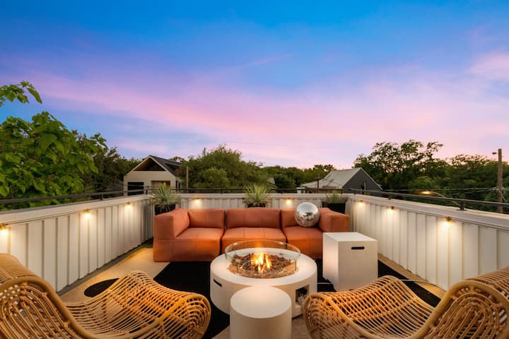 Geniet van de zon tussen de kronen van bomen of maak s'mores boven de vuurplaats op dit veelzijdige dak met toegang tot een eigen kitchenette, waaronder een minikoelkast, een grote gootsteen en een aanrechtruimte voor de voorbereiding. Ontspan op comfortabele banken terwijl je de schoonheid van de skyline van Austin bewondert of een diner op het dak samenstelt aan de grote eettafel voor 8 personen.
