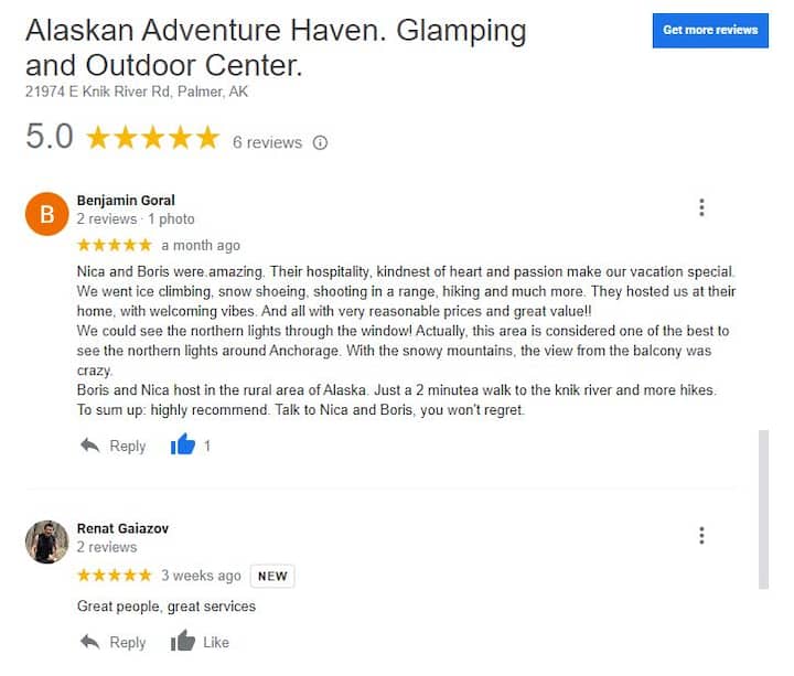 We zijn opgegroeid in Israël en bezochten Alaska 25 jaar geleden voor het eerst. Na meerdere keren terug te zijn teruggekeerd voor nieuwe avonturen, verhuisden we 5 jaar geleden als een gezin van vier personen naar Alaska en openden we hier ons droomglamping- en begeleidingsbedrijf.