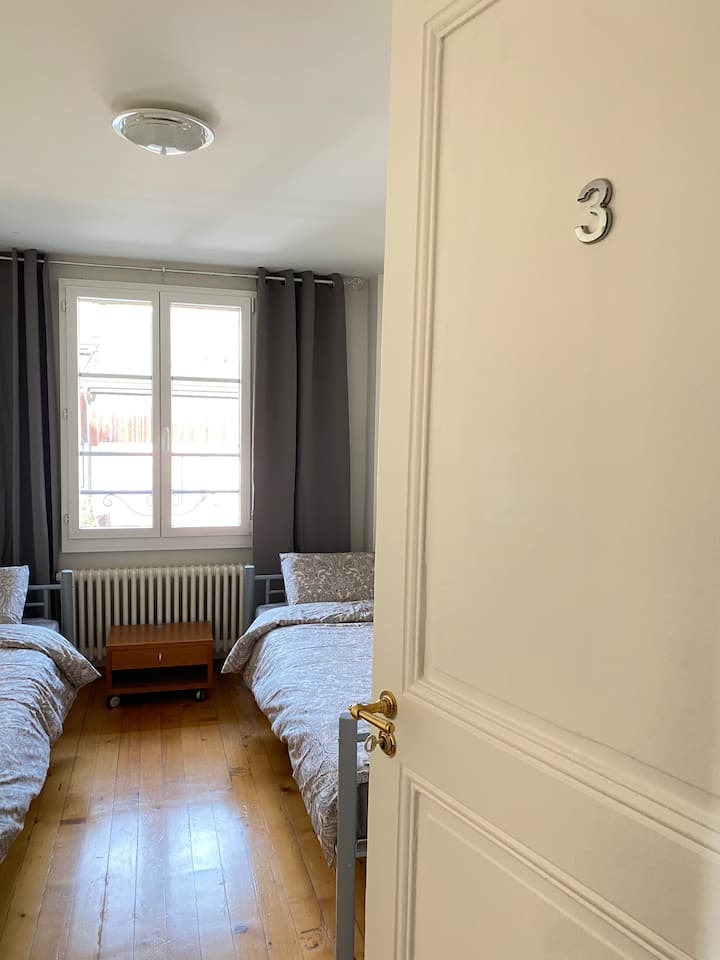 Een privékamer (kamer nr. 3) met twee eenpersoonsbedden en een slot op de deur. Het biedt plaats aan maximaal 2 gasten. De prijs is voor één slaapkamer per nacht.