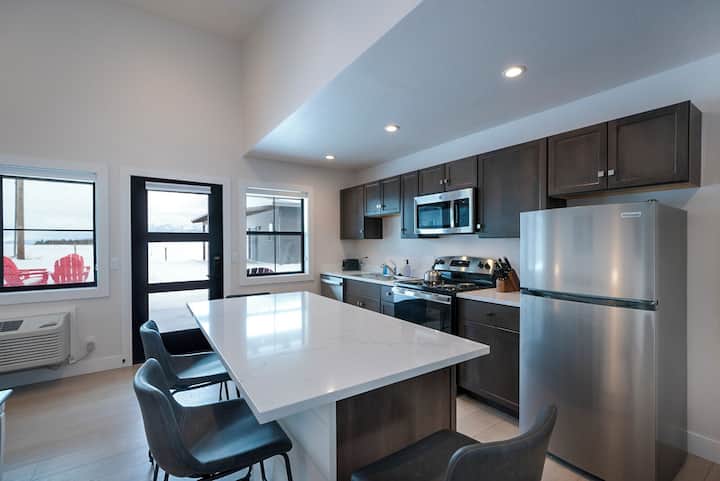 Deze unit is een ontwerp met één verdieping met een kingsize hoofdslaapkamer en een complete badkamer, smaakvol ingericht en geschikt voor gezinnen, vriendengroepen of koppels. De unit is geschikt voor maximaal vier personen, met de woonkamer met een comfortabele queensize slaapbank. Elke unit is volledig uitgerust met verwarming/airconditioning, een volledige keuken met granieten werkbladen en een eetbar met vier barkrukken. De woonkamer biedt een streaming grote tv, twee buitenstoelen op de veranda en een tafel voor het plezier van de gasten. De primaire slaapkamer heeft een kingsize bed waar je na een leuke dag met pensioen kunt gaan en kunt dromen over de avonturen van de volgende dag. De accommodaties zijn ook gast- of gezinsvriendelijk, omdat de Queen uitschuifbare slaapbank voor twee personen biedt. De gemeenschappelijke ruimte biedt barbecues, een grote gashaard op de centrale binnenplaats en gemeenschappelijke wasmachines met munten die alle gasten kunnen gebruiken. Deze bevindt zich op de benedenverdieping van het Cottages-gebouw. De wasruimte heeft een elektronisch slot en is 24/7 geopend. Daarnaast bieden eenheden een en twee, drie en vier en vijf en zes gemeenschappelijke afsluitbare deuren tussen elke unit, zodat je een 2Bd/2BA-unit kunt boeken om de ruimte te delen met vrienden en familie, indien gewenst. Bekijk onze 2Bd/2BA-advertentie als je deze accommodatie wilt boeken. Er is parkeergelegenheid voor alle eenheden.