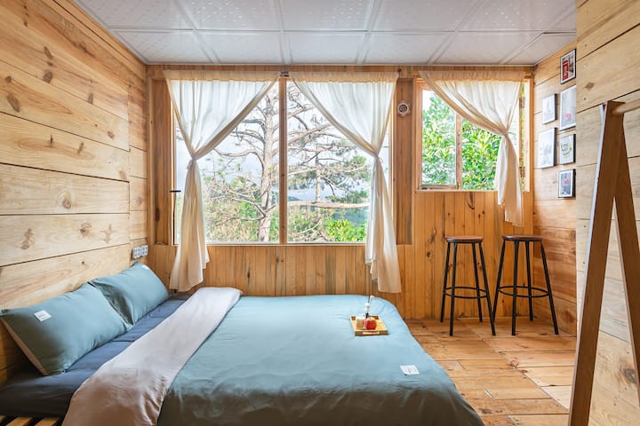 Houten huis met uitzicht op dennenbos