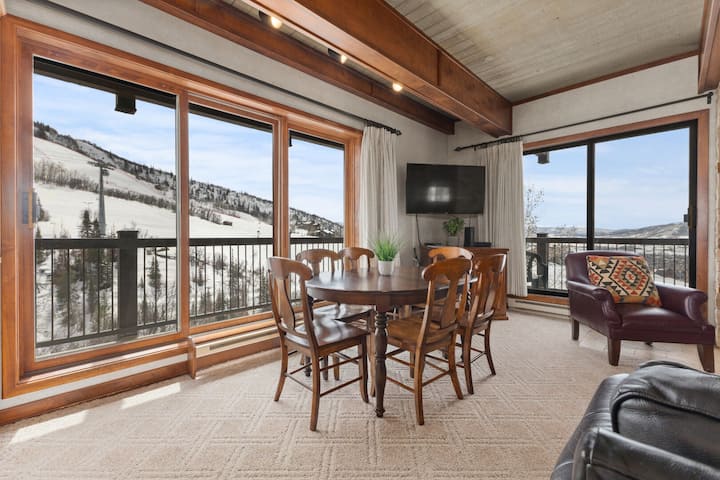 Dit appartement heeft alle uitzichten! Je hebt het gevoel dat je aan de rand van de berg staat met ononderbroken uitzicht op de helling, uitzicht op de vallei, uitzicht op de zonsondergang en een idyllisch uitkijkpunt voor Steamboat 's beroemde alpenglow van Steamboat. Het skigebied ligt op het westen, dus 's avonds, als de zon laag daalt, gloeien de skipistes vaak in goud, oranje, rood, roze of paars. Vanuit dit appartement heb je ook de perfecte plek om buiten te dineren en om het vuurwerk van het skigebied en fakkelparades en heteluchtballonfestivals van het skigebied te bekijken. Je kunt ook genieten van wat uitzicht op dieren in het wild. (Bekijk de 2 elanden die buiten ontspanden toen onze fotograaf langs kwam.) Het balkon wikkelt zich rond het appartement, vanuit slaapkamer 1, voorbij slaapkamer 2, de woonkamer en wikkelt zich vervolgens rond naar de eetkamer. Met de gordijnen open, laten het raam van vloer tot plafond en 4 sets glazen schuifdeuren veel natuurlijk licht toe om het appartement te vullen en dienen als een constante herinnering aan wat een prachtige plek je bent.