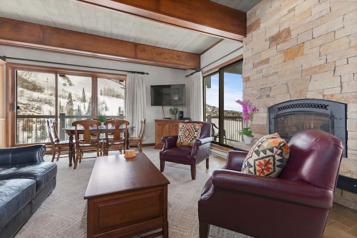 De klassieke, verhoogde stijl van het appartement is voorzien van leren en massief houten meubels, aangepaste plinten en deuren. De woonkamer is een grote ruimte met de woonkamer, eetkamer en keuken. Het beslaat de hoek van het gebouw en heeft uitzicht van het oosten naar het zuiden en westen. De grote HDTV en mooi verbouwde gestapelde stenen open haard voegen entertainment en sfeer toe. Of je nu ontspant op de bank, een maaltijd bereidt of spelletjes speelt aan de eettafel, je hebt aan de ene kant uitzicht op het skigebied en aan de andere kant heb je uitzicht op het basisgebied, de Yampa Valley en zonsondergangen. Het appartement heeft zelfs een ingang met een bank en vakken voor het opbergen van je laarzen, jassen en andere spullen.
