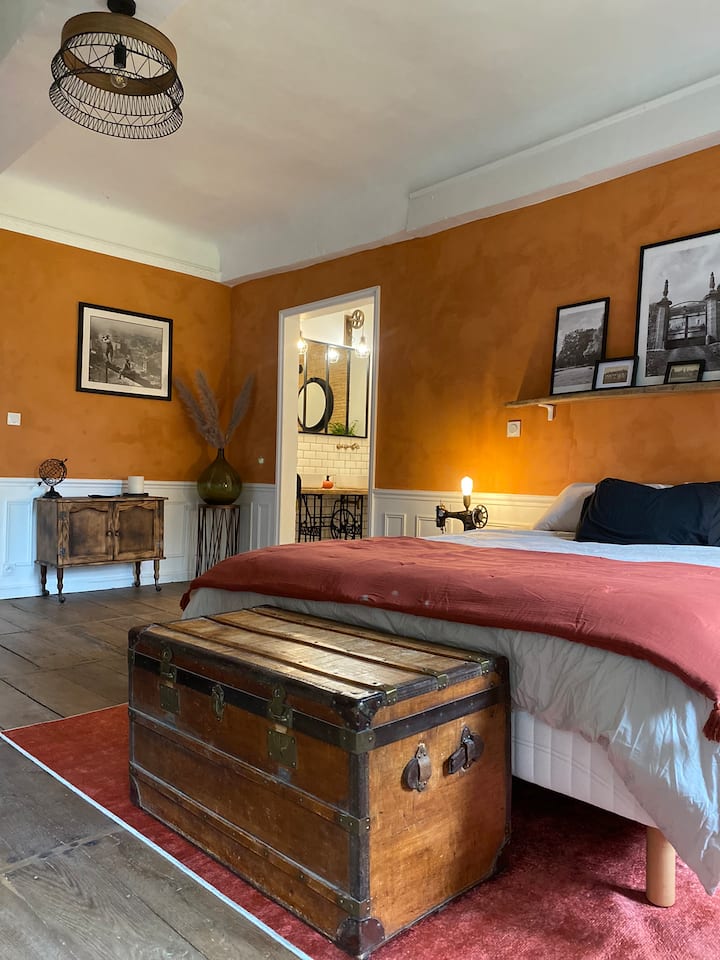 Gelegen op de eerste verdieping van het herenhuis, is de slaapkamer toegankelijk vanaf de monumentale trap en de gemeenschappelijke gang naar de twee verhuurbare slaapkamers van het landgoed.