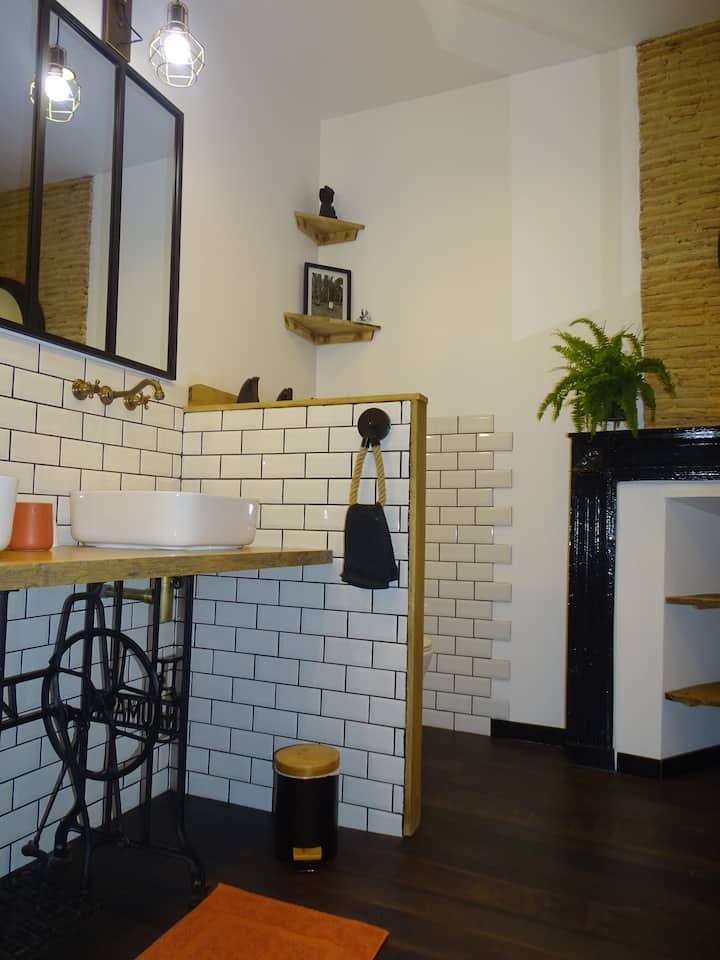 In deze kamer in industriële stijl, waarvan het materiaal (hout, metaal, baksteen...) onze reflectie heeft georiënteerd, staan twee eenpersoonsbedden van 90x200cm of een bed van 180x200cm op je te wachten. Er is ook een kleine zithoek voor je beschikbaar.