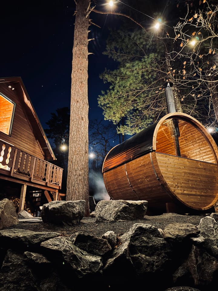• Buitensauna// Geniet van een Scandinavische levensstijl van Northwoods met onze traditionele houtgestookte cederhouten barrel sauna voor maximaal zes personen. Plus een buitenkoeldouche beschikbaar in het seizoen.