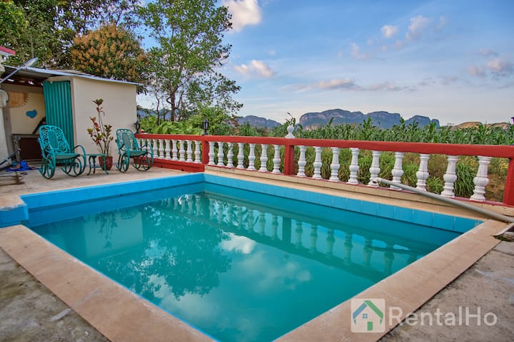 Welkom in ons huis in Viñales, waar je de ware schoonheid van Cuba kunt ervaren. Met een prachtig uitzicht op de mogotes is ons huis de perfecte plek om te ontsnappen aan de drukte van de stad en te genieten van de rust van de natuur. Vanaf ons gemeubileerde terras kunt u genieten van een heerlijk ontbijt, terwijl u geniet van het prachtige uitzicht op de maïsplantages, of een duik nemen in het verfrissende zwembad na het verkennen van de omgeving.