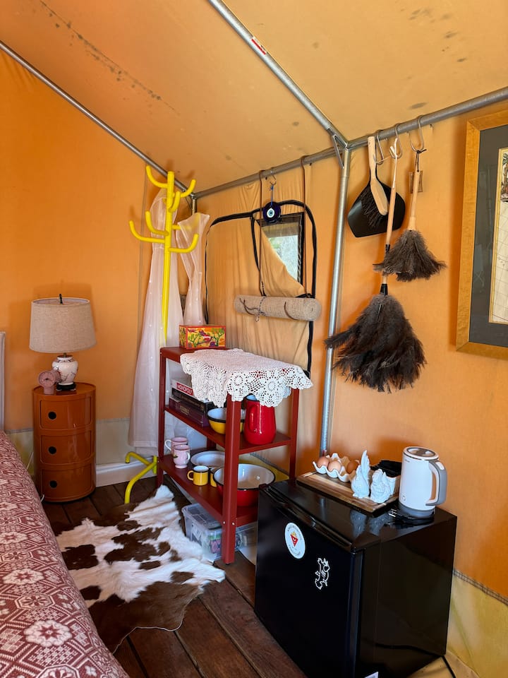 15. Elektriciteit: Zonnepanelen voeden de camping en de tenten hebben een paar stopcontacten die alleen mogen worden gebruikt voor het opladen van telefoons en apparaten (max. 500 watt). Probeer geen grote elektrische apparaten te gebruiken; ze zullen de stroomonderbreker voor je tent uitschakelen. (bijvoorbeeld geen haardroger).