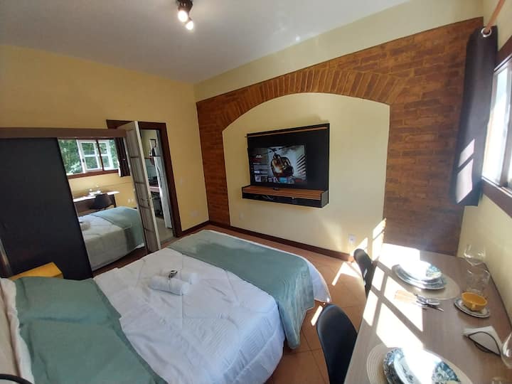 Daarnaast biedt het dwarsventilatie en een groot raam in de kamer met uitzicht op de achterkant van Av. Koeller, waar enkele van de belangrijkste hotels/Pousadas en historische huizen van Petrópolis zich bevinden.