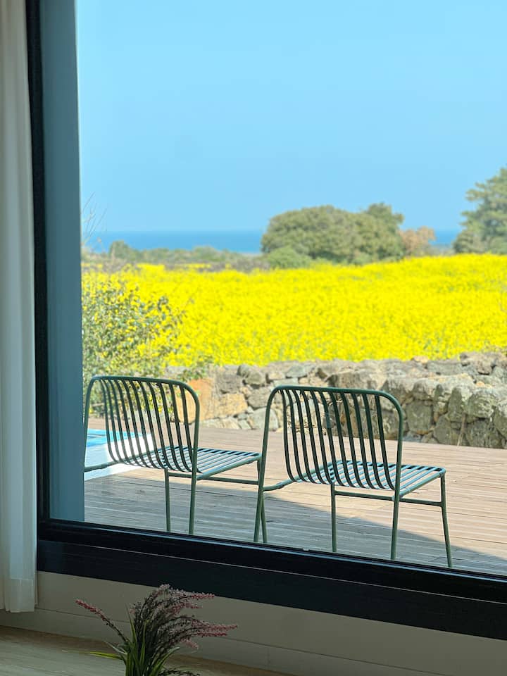 Het is een privévilla met zwembad met uitzicht op de zee van Hadori, een rustig en schoon oostelijk dorp van het prachtige Jeju.