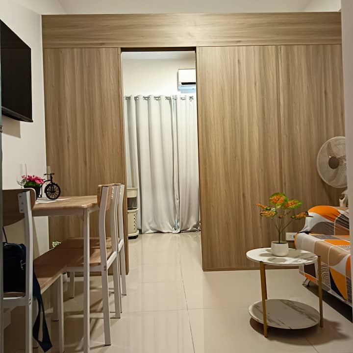 Een unit met één slaapkamer in een hoogbouw condo langs EDsa uitgerust met de volgende kenmerken en voorzieningen op de kamer: