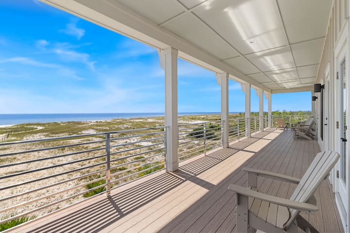 Amistad, genesteld op het westelijke puntje van Mexico Beach, wat 'vriendschap' betekent, biedt een adembenemend panoramisch uitzicht op de Golf en het kanaal. De tweede verdieping beschikt over een dramatische grote kamer met prachtige cipressenplafonds en een open keuken met aanrechtbladen van kwarts en een inloopkast, ideaal voor culinaire liefhebbers. De mastersuite, met een eigen wrap-around balkon, biedt een luxe spa-geïnspireerde badkamer met eersteklas afwerkingen.