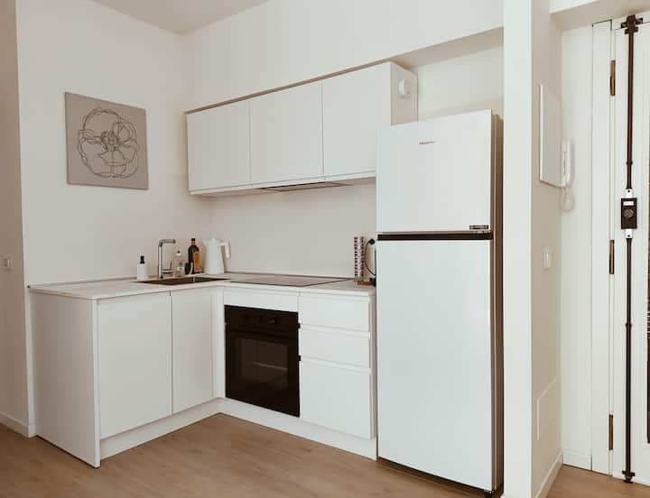 Op de eerste verdieping, de lift verlaten, aan de rechterkant is het appartement, aan de linkerkant een gedeelde ruimte waar je het afval netjes kunt opbergen, dat elke ochtend wordt opgeruimd.