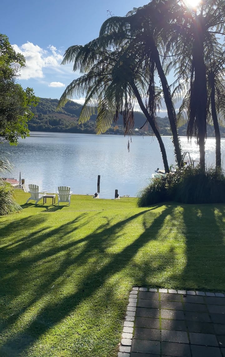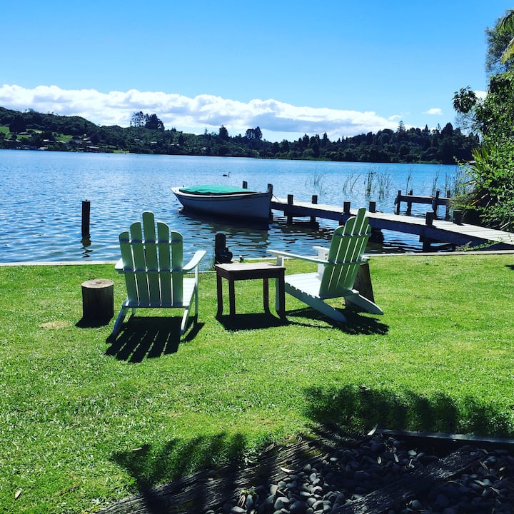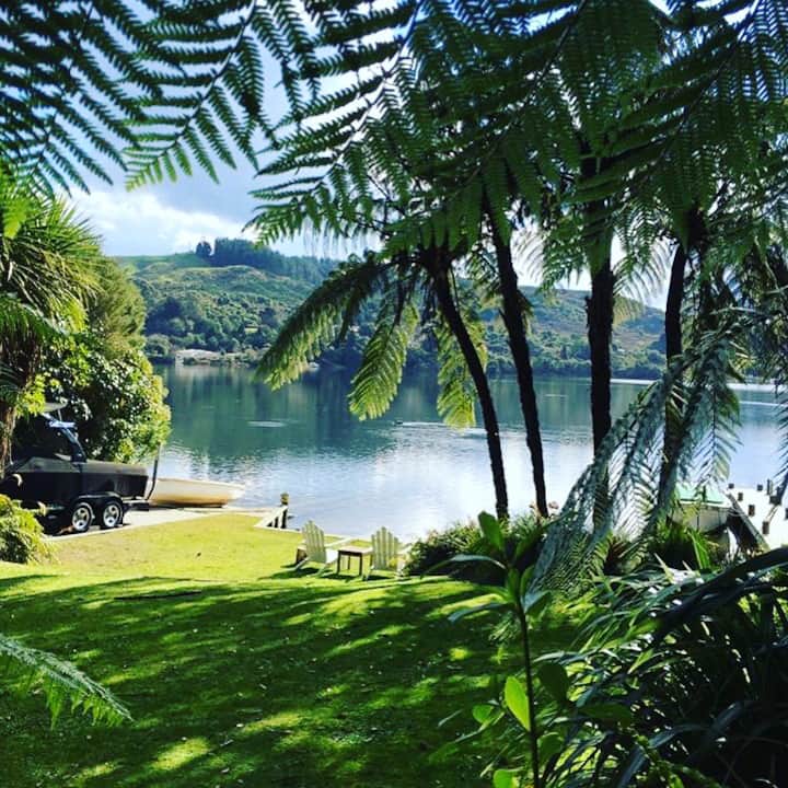 Romantisch en afgelegen dit zelfstandige huisje ligt tussen de inheemse struiken. Meter vanaf de waterkant, met steiger en oprit, gratis gebruik van kajaks, Stand up paddleboards. 25 minuten van Rotorua, op slechts 15 minuten van de luchthaven. 5 minuten naar het dichtstbijzijnde café. Geniet van bushwalks of mountainbiken van wereldklasse in het Redwood Forest. kajakken op het meer of zelfs raften op de beroemde rivier de Kaituna.