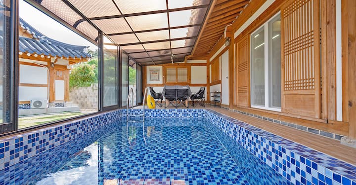 Het bestaat uit een privéhuis en elke kamer heeft een zwembad en barbecue.