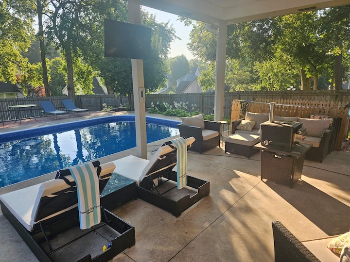 Seizoensgebonden zwembad met eigen, omheinde buitenruimte met een vuurplaats, grillen/roken, pizzaoven, tuinmeubilair met grote tv en cornhole.