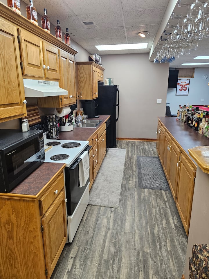 Kelder met projector-tv naast 2 andere grote tv's om alle spellen te bekijken. Bar, nieuw gevulde pooltafel en veel ruimte voor je groep om samen te genieten van quality time voor, na of tijdens het spel.