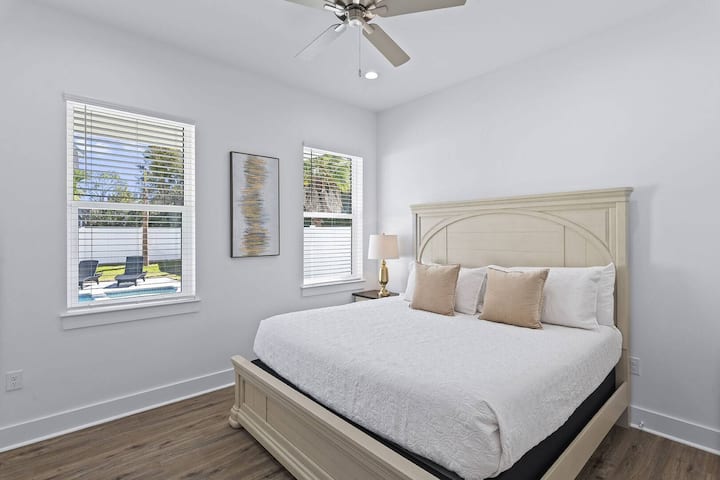 De woning ligt in de buurt Crystal Beach, op een korte wandeling van het openbare strand langs de Emerald Coast. Een golfkar met zes zitplaatsen is inbegrepen, waardoor het gemakkelijk is om de omgeving te verkennen, de Scenic Gulf Drive te verkennen of naar Destin Commons te gaan om te winkelen en te dineren zonder je auto te verplaatsen.