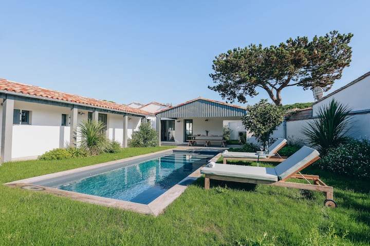 Het interieur van de villa is elegant ingericht, met een woonkamer badend in het licht op het zuiden, royaal uit op de tuin en het zwembad. Ideaal gelegen in de buurt van de stranden, winkels, haven, markt en restaurants, biedt deze luxe villa je een uitzonderlijk verblijf om je batterijen op te laden op het Ile de Ré met familie of vrienden.