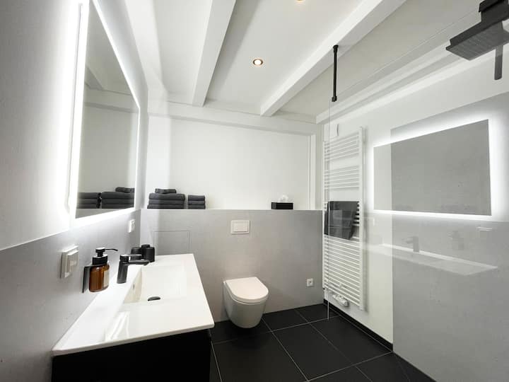 De stijlvolle badkamer is voorzien van vloerverwarming en een ruime, inloop regendouche. Een verwarmd handdoekenrek houdt je handdoeken droog, zelfs in de zomer, terwijl de grote, verlichte spiegel voldoende verlichting biedt voor je dagelijkse routine. Een haardroger en royale opbergruimte voor toiletartikelen dragen bij aan het gemak.