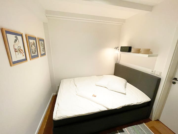 Op de benedenverdieping vind je een gezellige slaapkamer met een queensize bed (140x200 cm). Een high-end Bluetooth Marshall-speaker biedt een uitstekende geluidskwaliteit, terwijl een stijlvolle touwgarderobe (Loop Rope) en een aan de muur gemonteerde plank praktische opbergruimte voor kleding bieden.