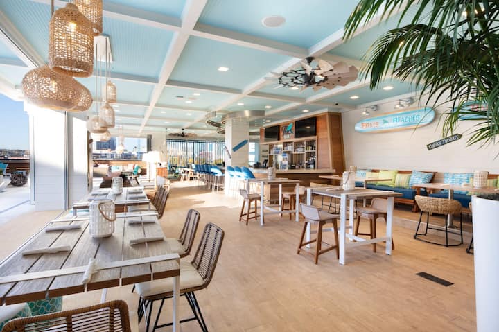 De tropische sfeer gaat door in de FINS Beach Bar en de JWB Grill, met heerlijke eetgelegenheden.
