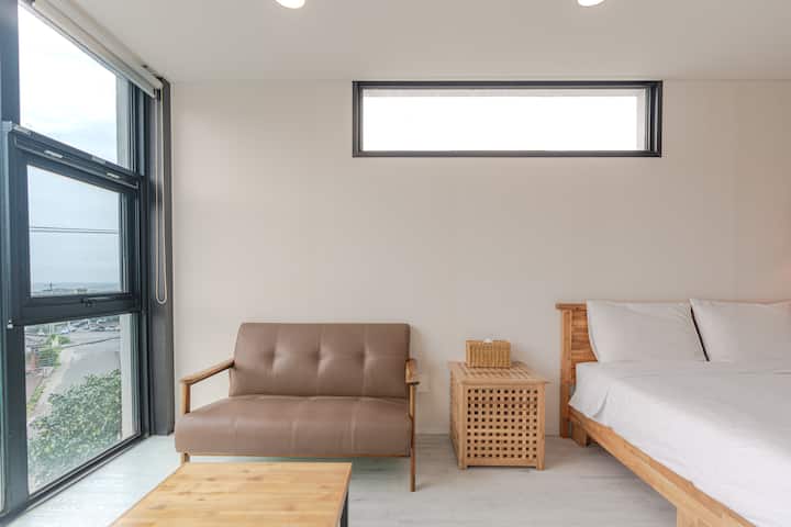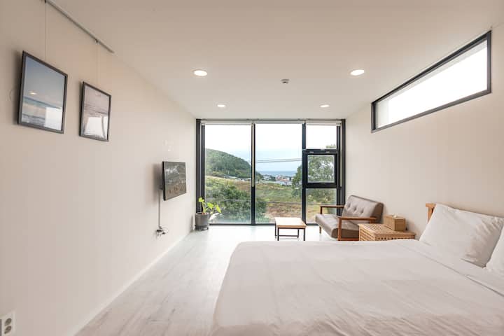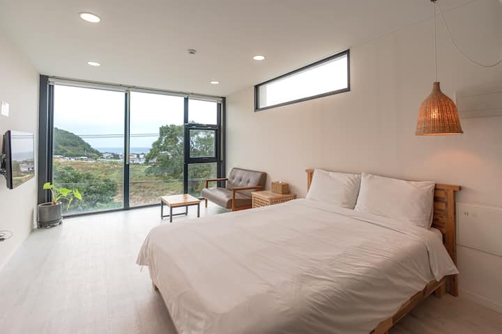 De villa heeft kamerhoge ramen met uitzicht op het stuwmeer, het bos, de Jeju Zee en Susang Peak. De duplexkamers op de 3e verdieping bieden een panoramisch uitzicht.