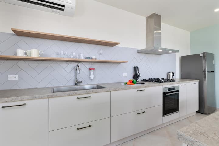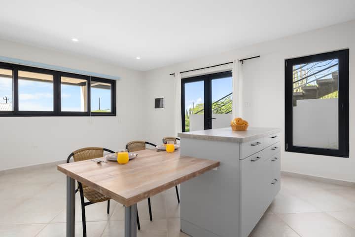 De keuken is een culinair toevluchtsoord, uitgerust met eersteklas apparaten, kookgerei en keukengerei - ideaal voor het bereiden van je favoriete maaltijden. Geniet van je creaties aan de gezellige eettafel, die ook dient als een handige werkplek om verbonden te blijven of taken bij te praten. Een strakke, complete badkamer met alle benodigdheden maakt deze uitnodigende ruimte compleet, waardoor het een gastvrije uitvalsbasis is voor je avontuur op Aruba.
