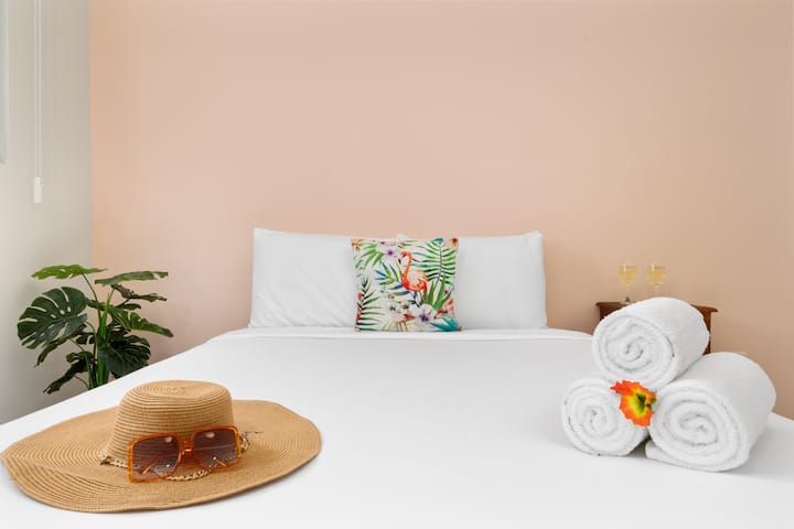 Deze gloednieuwe 2BR 1BA-retraite is het perfecte toevluchtsoord voor reizigers die op zoek zijn naar zowel comfort als gemak. Twee met zorg ontworpen slaapkamers, elk met zachte queensize bedden en smart-tv's, beloven rustgevende nachten en ontspannen entertainment.