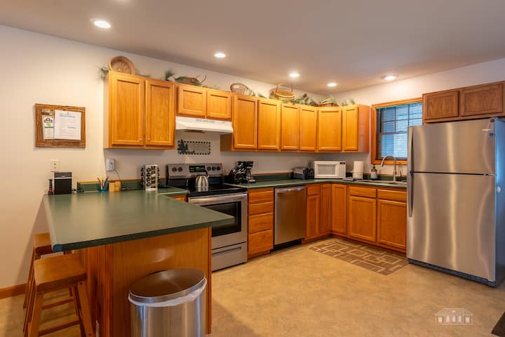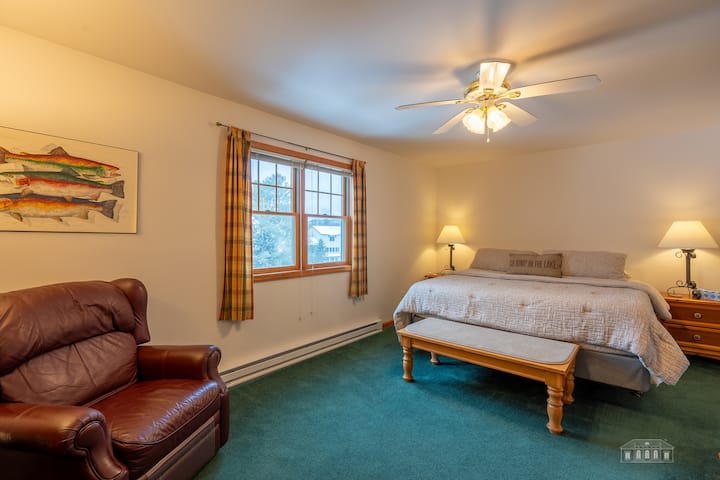 Deze woning met 3 slaapkamers en 2,5 badkamers biedt plaats aan maximaal 8 gasten en de gastvrije open plattegrond zorgt ervoor dat je gemakkelijk samen kunt komen. Geniet van een gezellige woonkamer, een volledig uitgeruste keuken met alle benodigde kookgerei/borden die nodig zijn voor het gemak van het bereiden van maaltijden om thuis te dineren en de eettafel biedt plaats aan 6 personen naast het aanrecht met 2 krukken. Er is een plafondventilator in de belangrijkste woonkamer, samen met alle slaapkamers en de wifi-verbinding in het hele huis zorgt ervoor dat gasten op sociale media kunnen bijpraten waar ze zich het meest comfortabel voelen. Het terras toegankelijk via de woonkamer met tuinmeubilair is ideaal om te genieten van een kopje koffie in de frisse Adirondack-lucht voordat je je avonturen voor de dag begint!