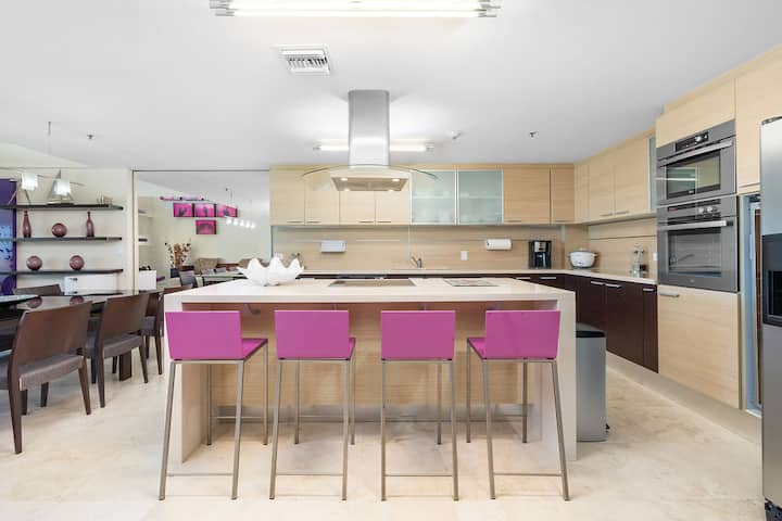 De designkeuken is een droom van een chef-kok, uitgerust met een koelkast/vriezer met waterdispenser, vaatwasser, magnetron, oven, kookplaat, koffiezetapparaat, broodrooster, blender en waterkoker - alles wat je nodig hebt om maaltijden of cocktails te bereiden om van te genieten op je eigen balkon.