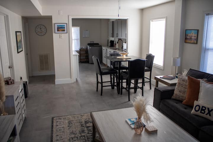 Dit schone, stijlvolle en volledig uitgeruste appartement is perfect gelegen voor je OBX-uitje. Boek nu en geniet van het beste van OBX, van plezier aan het strand tot adembenemende zonsondergangen bij Bay Drive, waar je kunt ontspannen in de zonnige tuinhuisjes en genieten van de schoonheid van het geluid, met al je strandbehoeften klaar en voor je klaar staat!